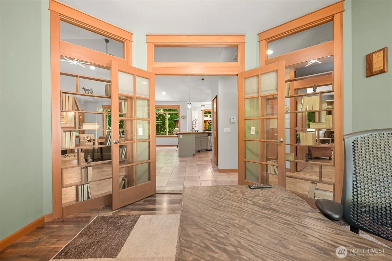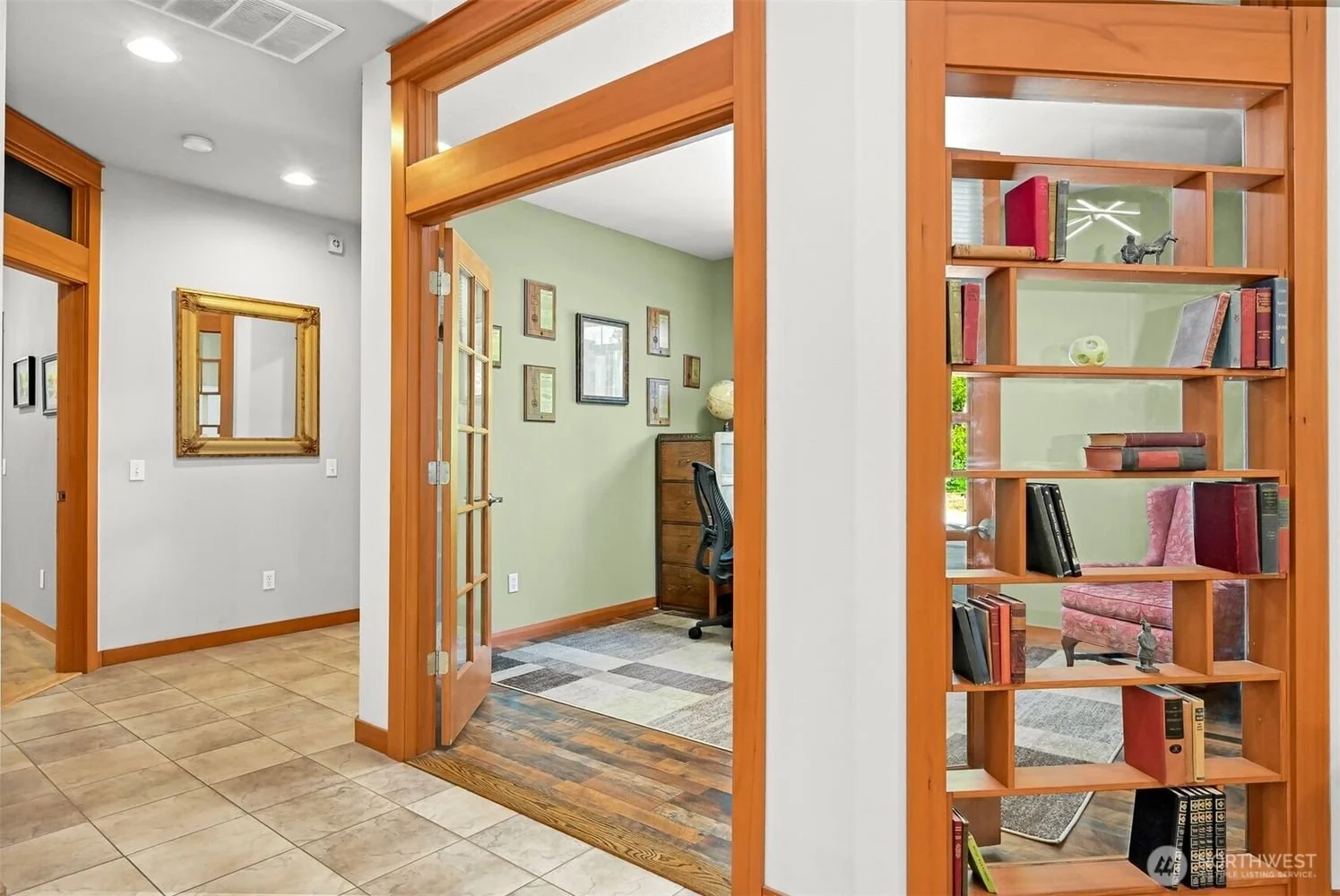 Interior view of a home with a transition between tiled and wooden floors, a green wall with framed pictures, a small wooden desk with an office chair, and a wooden bookshelf with books and decorative items.