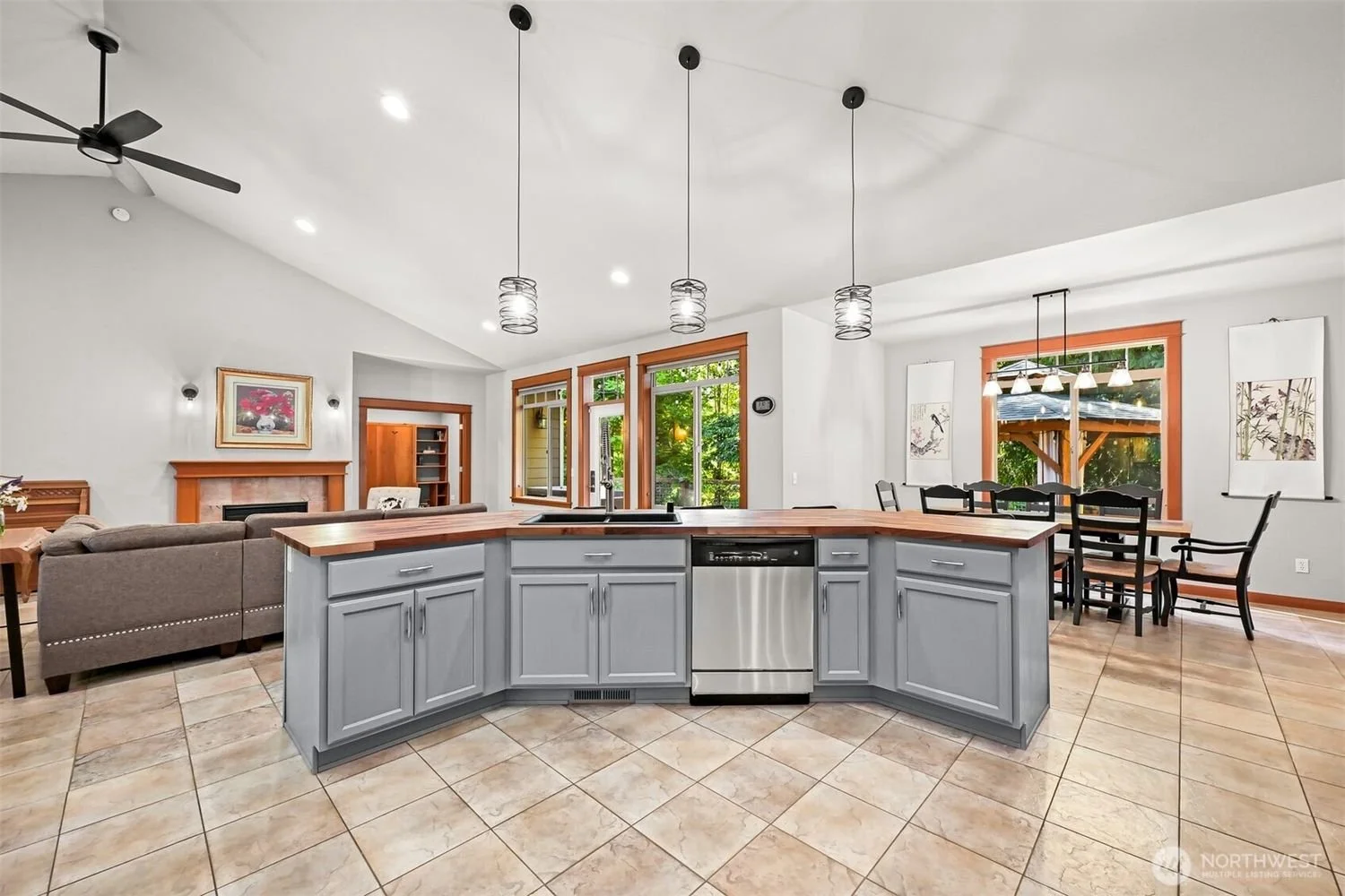 Open-concept kitchen with gray cabinets and wooden countertop, stainless steel dishwasher, and large windows with wood trim, connected to a dining and living area.