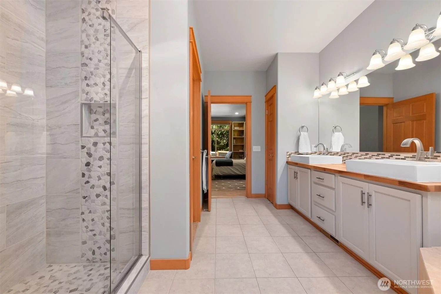 A spacious bathroom with a walk-in shower on the left, large double vanity with two sinks and a large mirror on the right, wooden trim and doors, and a view into a bedroom with a bed and window in the background.