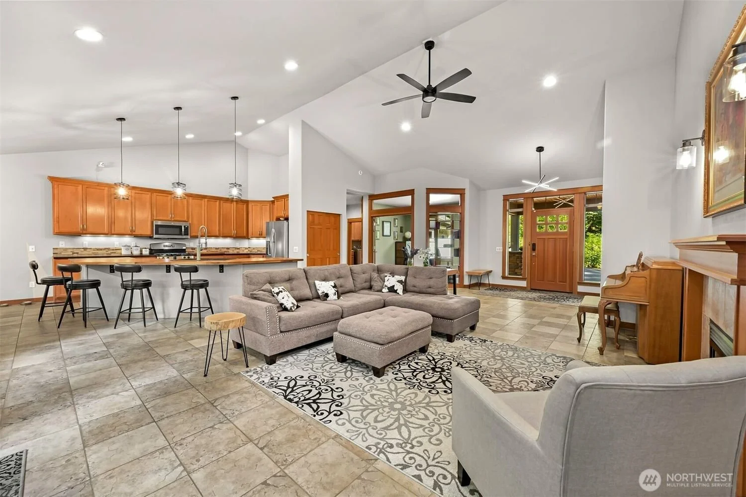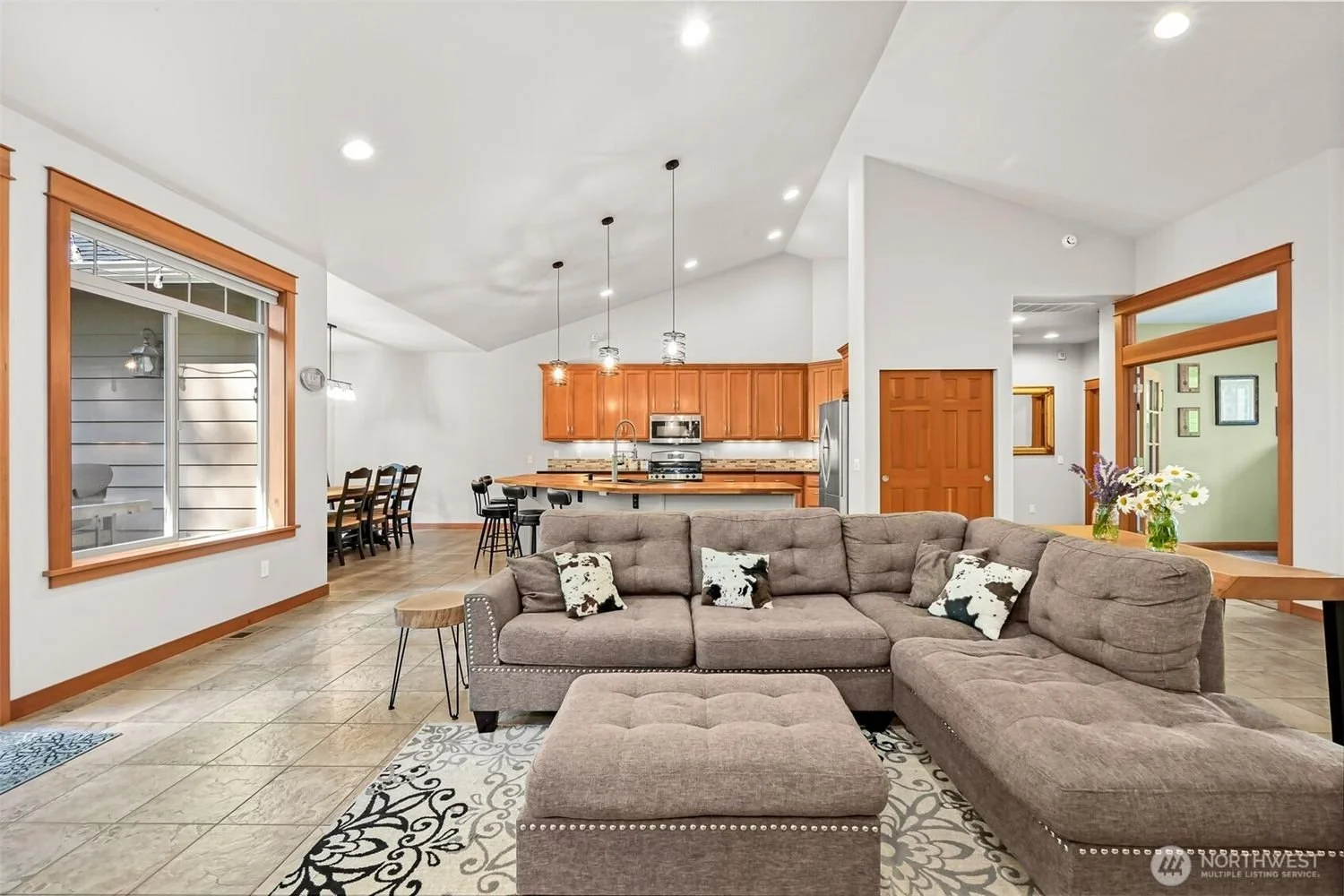 Open-concept living room and kitchen with beige tile flooring, gray sectional sofa with cowhide-patterned pillows, and a vase of flowers on a side table. The kitchen has wooden cabinets, a breakfast bar with black stools, and stainless steel appliances. Large windows and doorway provide natural light.