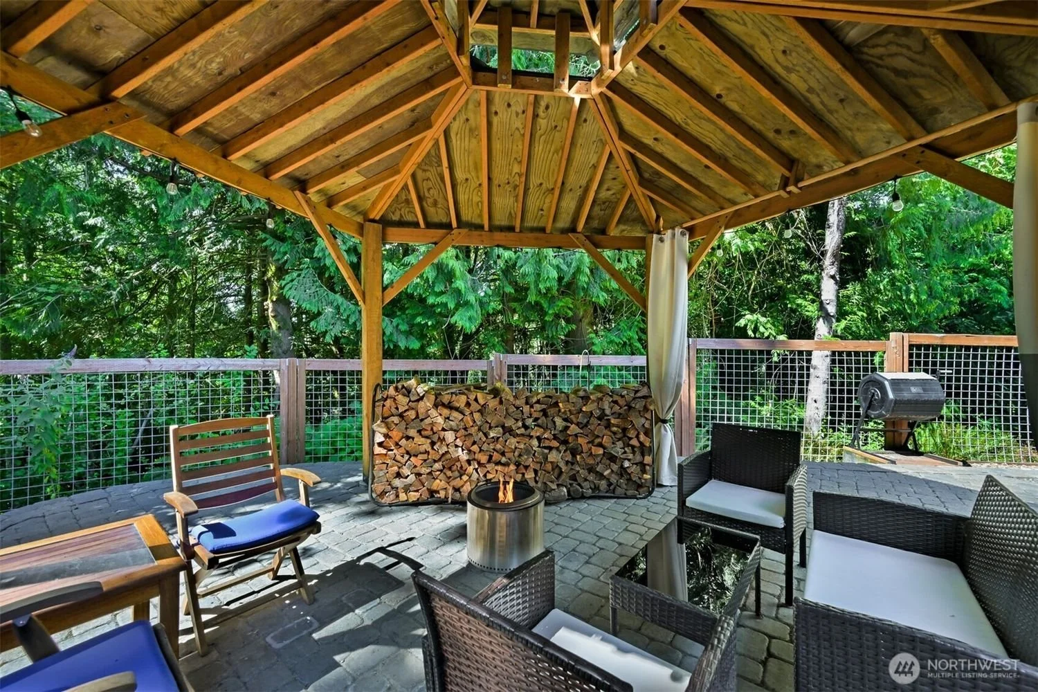 Covered outdoor patio with wicker seating, a wood pile, and a fire pit, surrounded by a wooden fence and green trees.