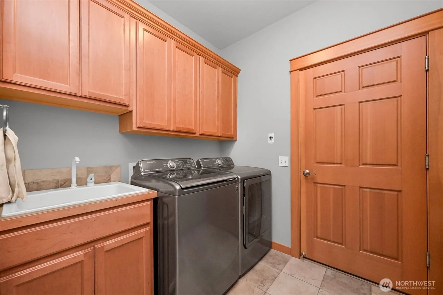 Laundry room with wooden cabinets, a sink, a washing machine, and a dryer, with a wooden door.