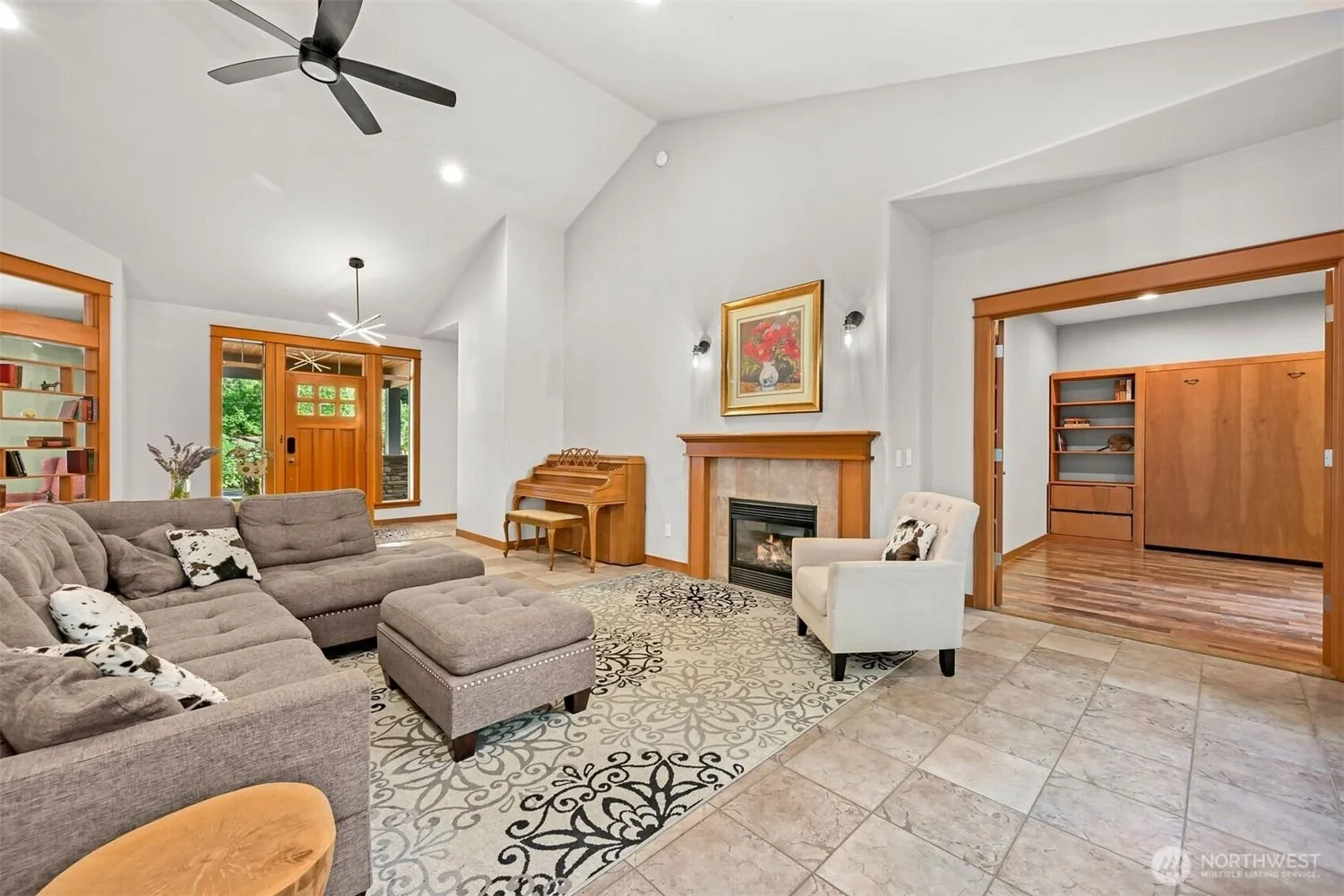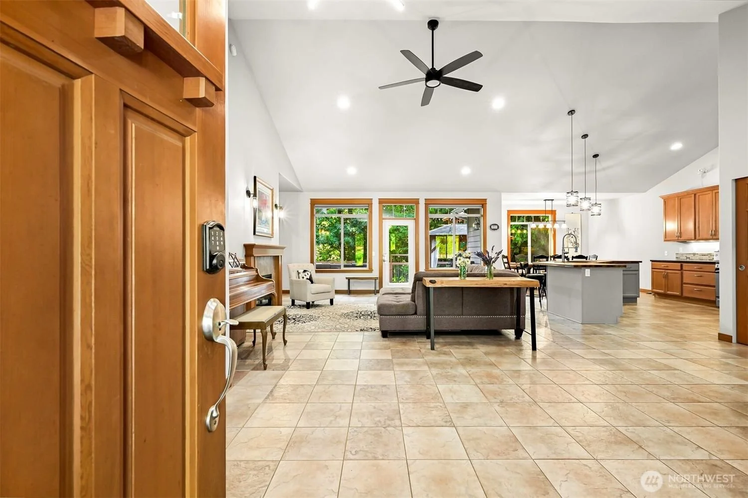 Open door leading to a spacious living area with tiled floor, wood cabinets, large windows, and modern furniture.