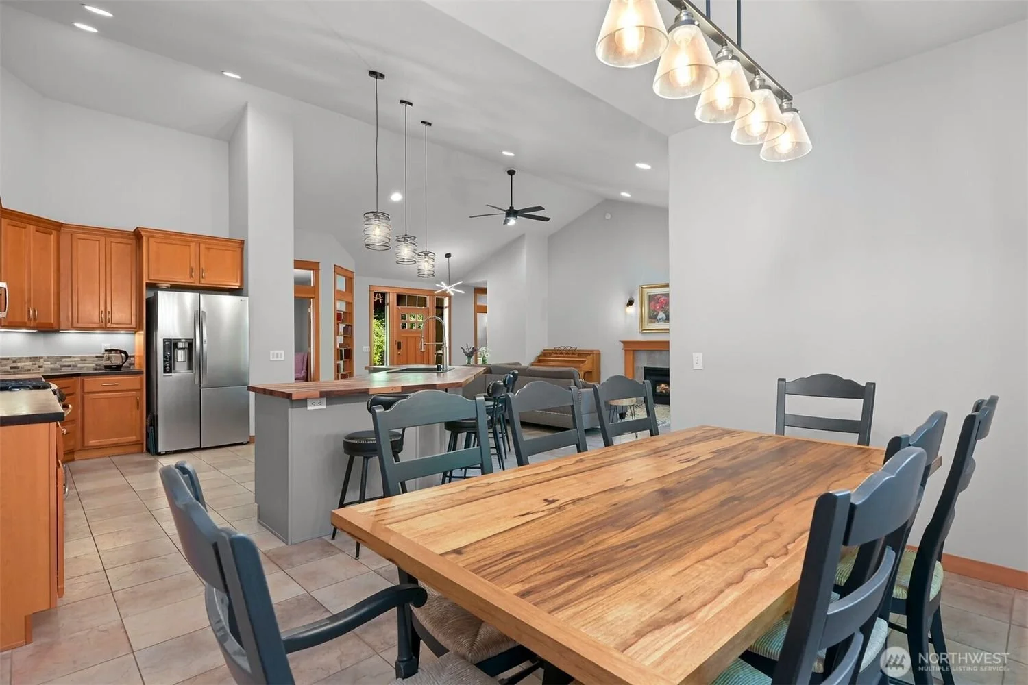 Open-concept kitchen and dining area with wooden dining table with black chairs, wooden kitchen cabinets, stainless steel refrigerator, kitchen island with black barstools, pendant lights above, and a living space with a couch and fireplace in the background.