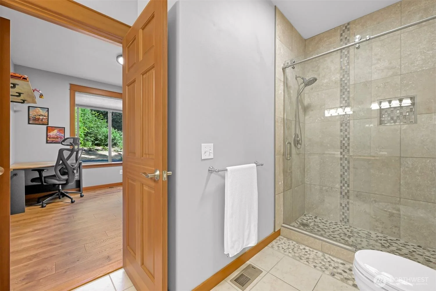 Bathroom with a walk-in shower with beige tiles and pebble floor, towel rack, and open door leading to a home office with a window, desk, office chair, and wall art.