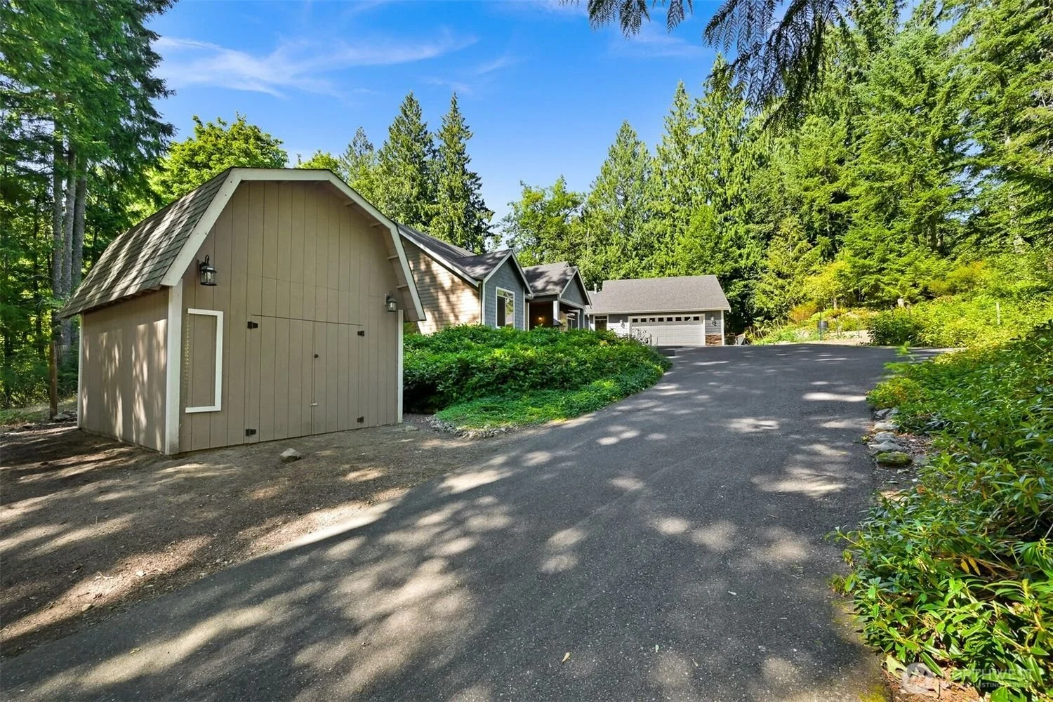 A paved driveway leading to a home surrounded by tall trees and greenery. There is a small shed on the left with a light fixture above the door, and the main house features a garage with white door and multiple gabled roofs.