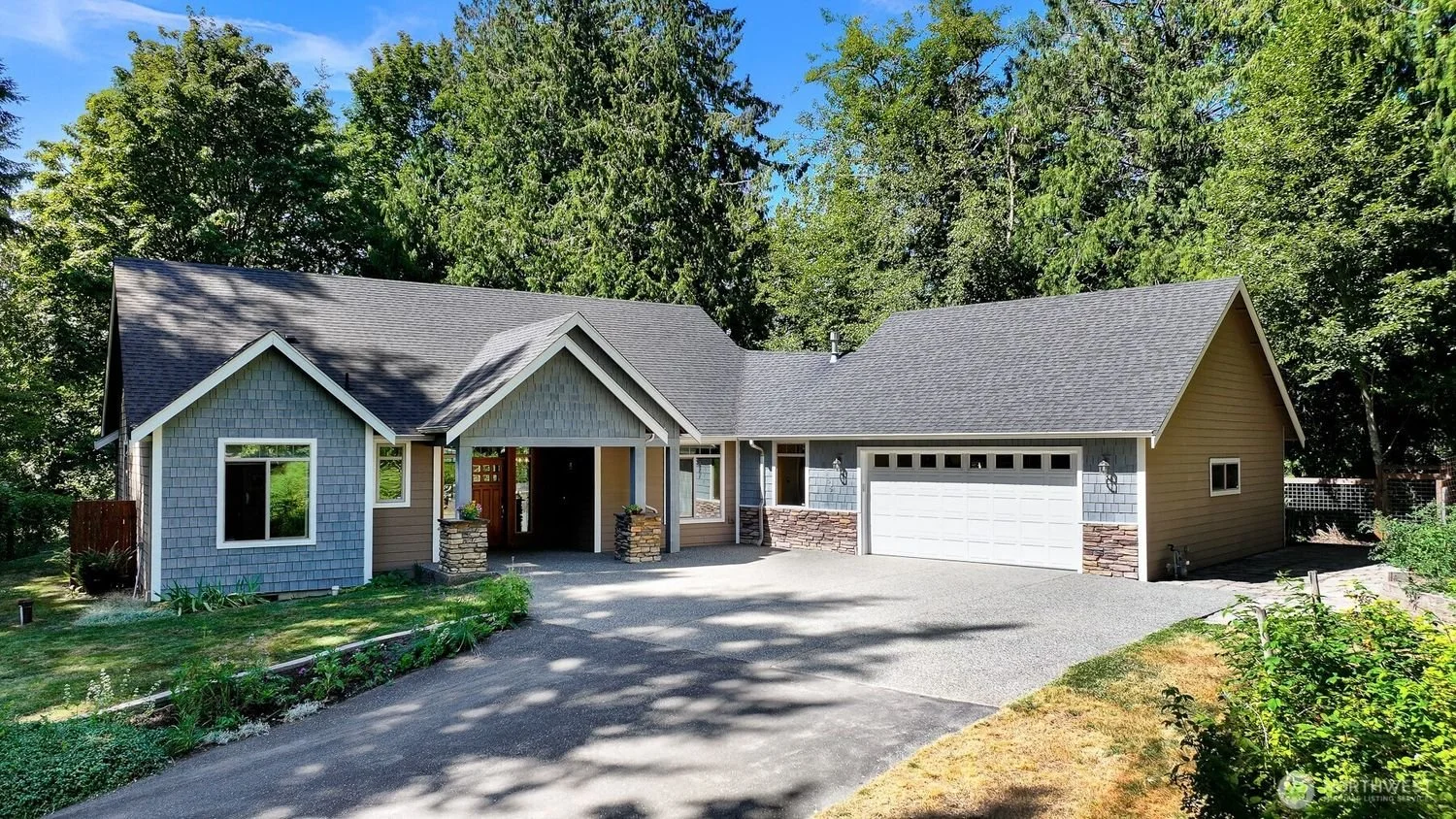 A single-story house with a front driveway, featuring blue shingle siding, a gray roof, and a two-car garage. The entrance has stone accents and a small porch with plants along the walkway. Tall trees surround the house.