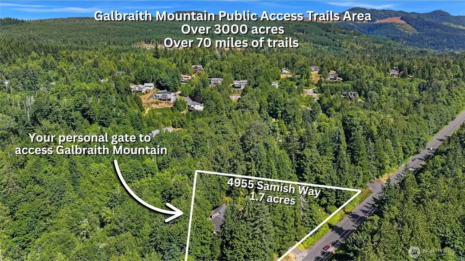 Aerial view of Galbraith Mountain with dense green forest, roads, and a few houses; overlayed with text promoting access to the mountain, including a personal gate, and highlighting a specific property at 4955 Samish Way.