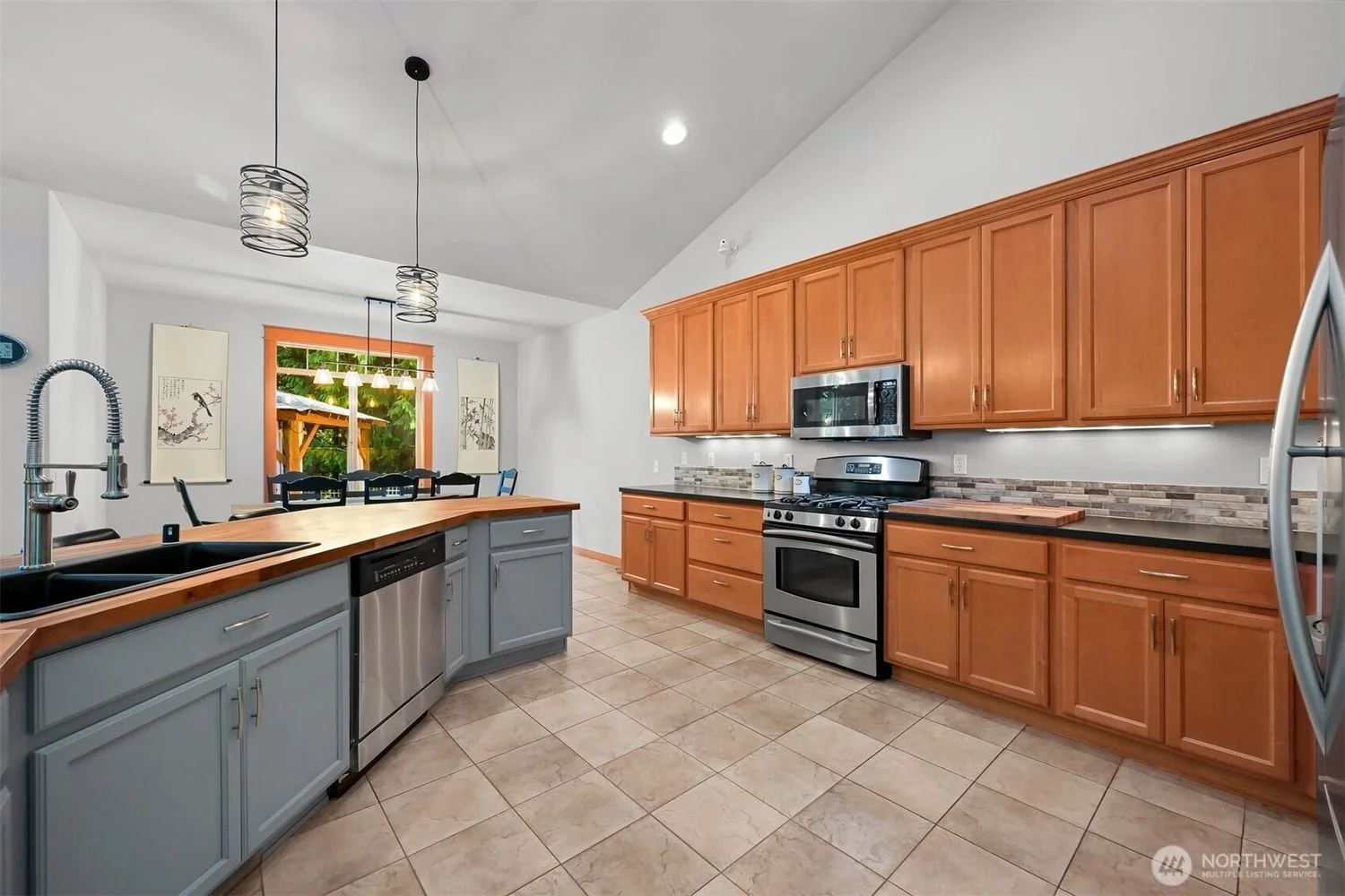 Kitchen with wooden cabinets, stainless steel stove and microwave, gray island with wooden countertop, tiled flooring, large windows showing a backyard, and modern lighting fixtures.