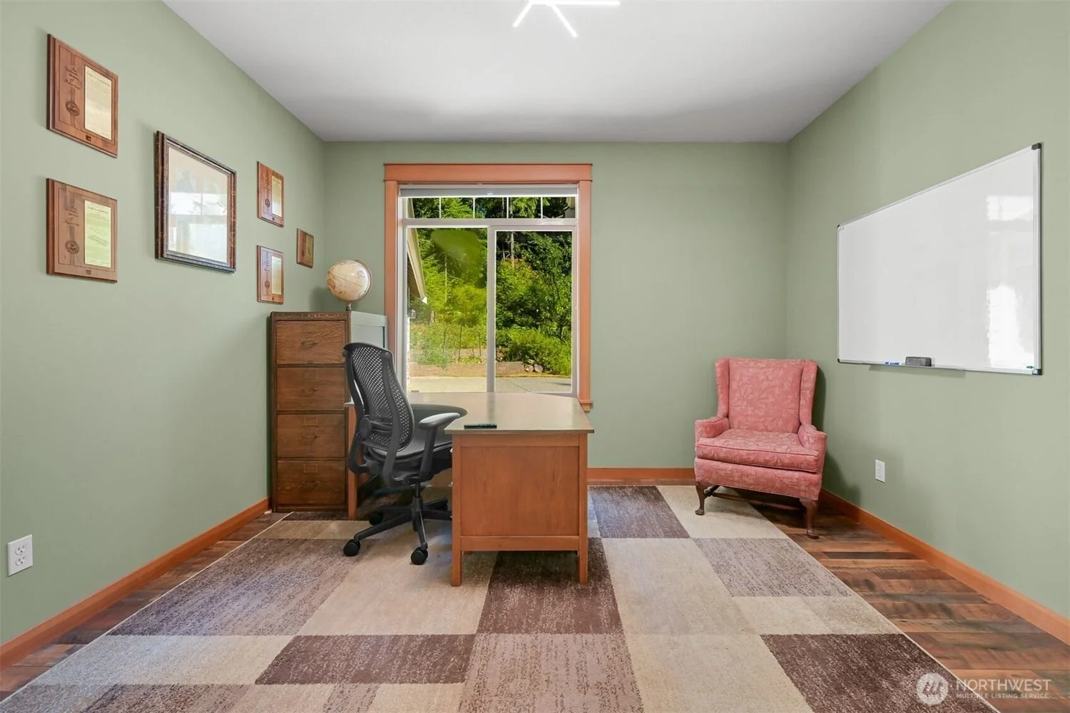Small office room with green walls, a wooden desk, black office chair, pink armchair, whiteboard, window with a view of greenery outside, framed certificates on the wall, and a patterned rug on wood flooring.