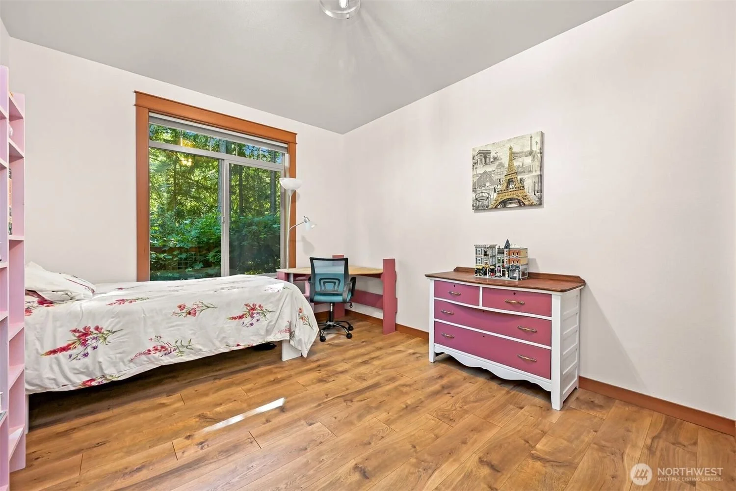 A bedroom with a wooden floor, a bed with floral bedding, a window with view of trees, a small desk with a black chair, a pink and white dresser, and wall art of the Eiffel Tower.