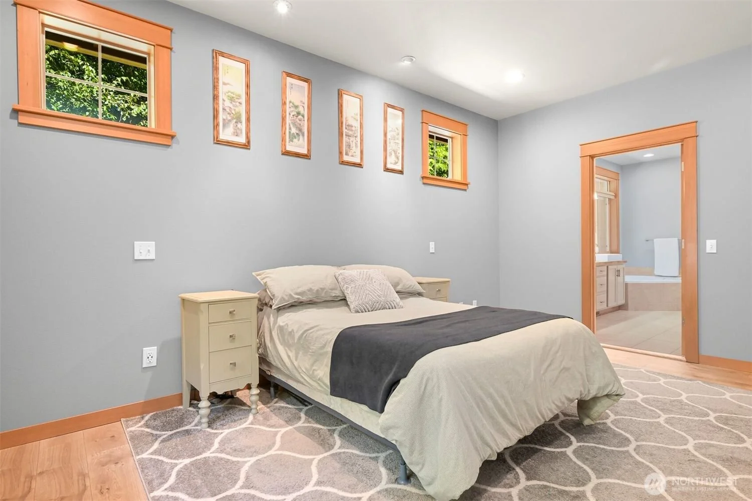 Bedroom with a bed, two nightstands, three small windows above, framed pictures on the wall, a patterned rug, and a doorway leading to a bathroom with a vanity and bathtub.