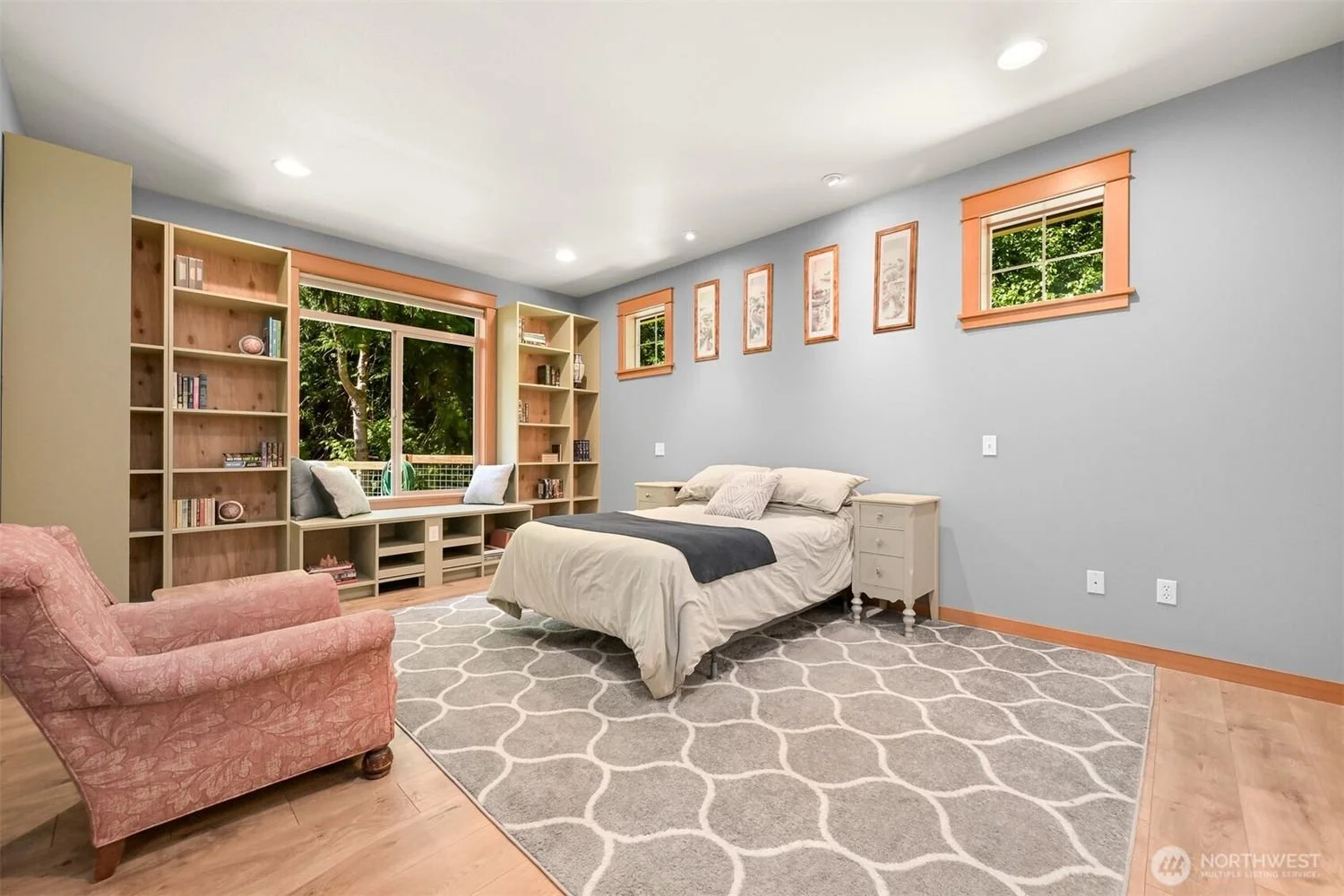 A bedroom with a bed, pink armchair, wooden bookcases, a window seat, three small windows, and framed pictures on the light blue wall.