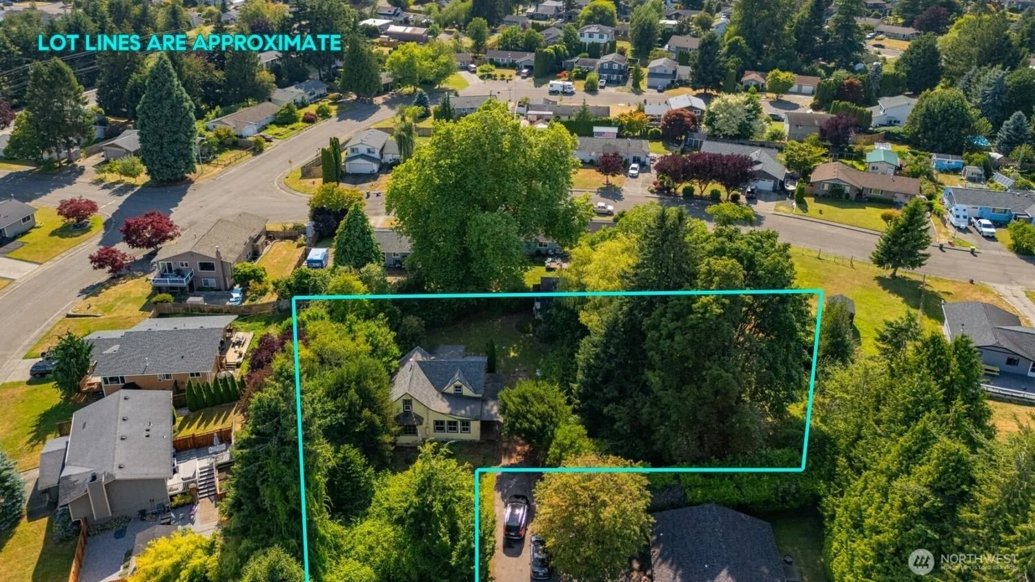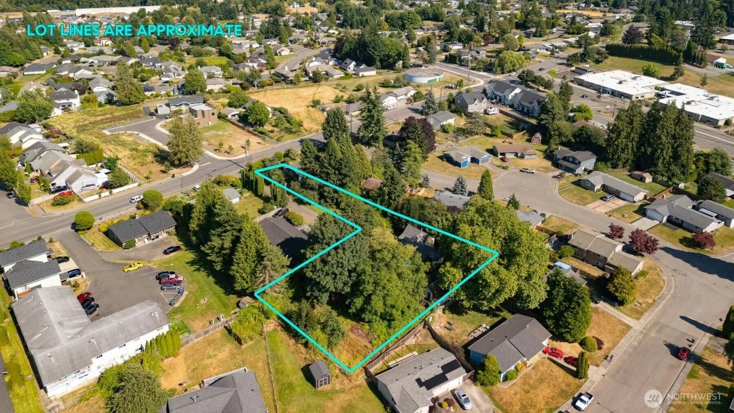 Aerial view of a neighborhood with houses, trees, and streets; a specific lot outlined in blue, with a note that lot lines are approximate.