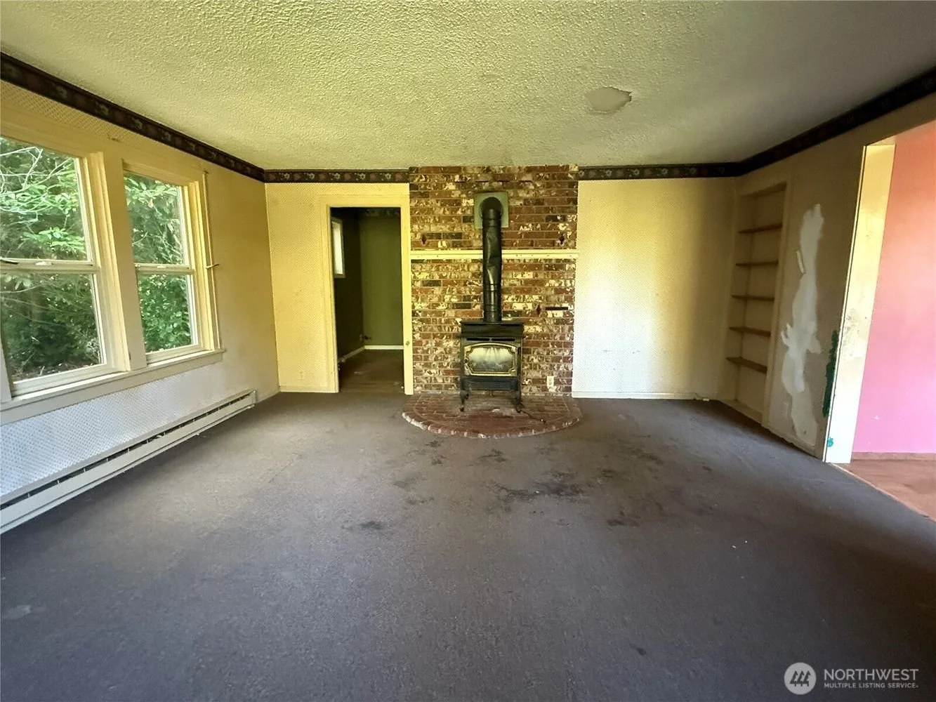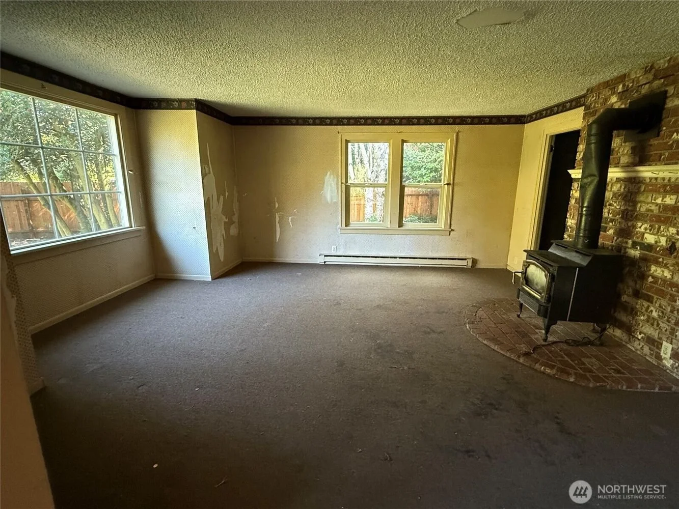 Empty living room with large window, patchy yellow walls, a brick fireplace with a wood stove, and a brown carpet.