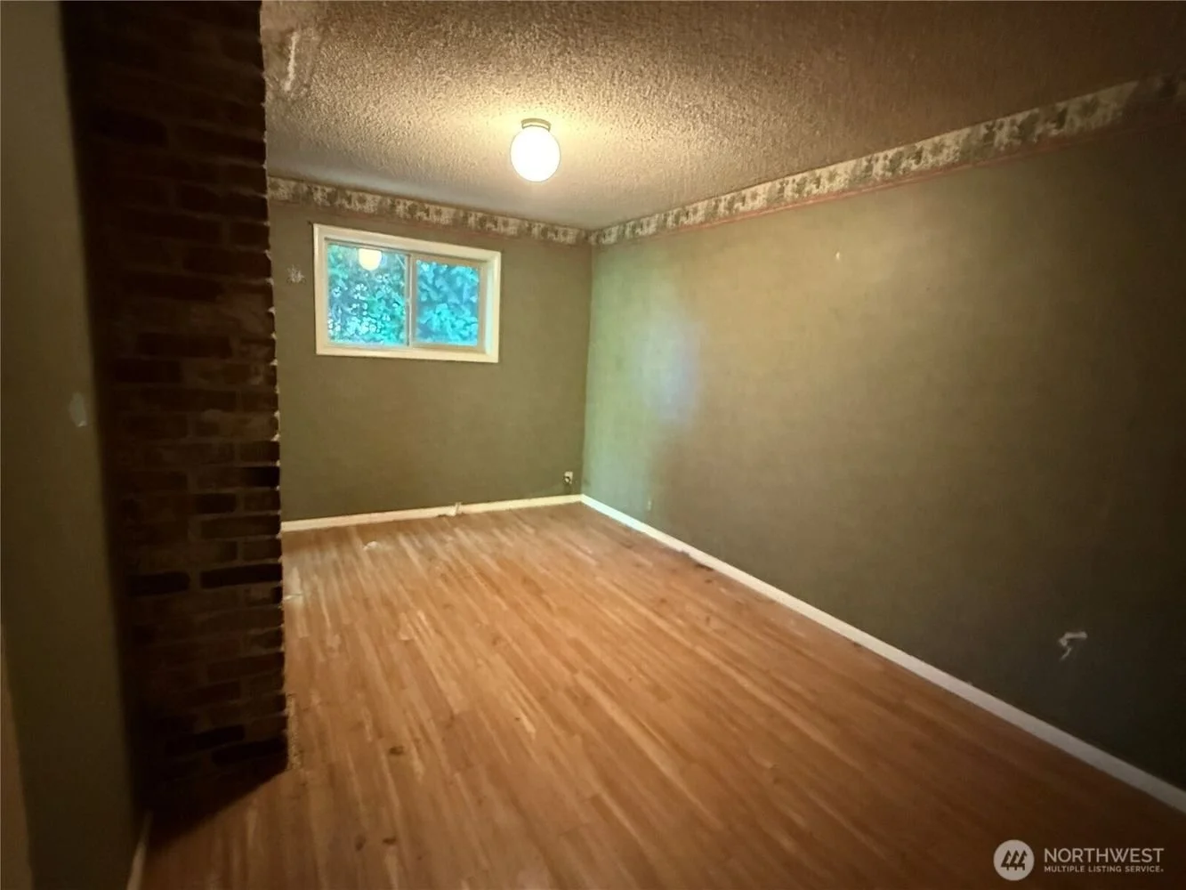 Empty room with green walls, hardwood flooring, a small window, a ceiling light fixture, and exposed brick anchor on one side.