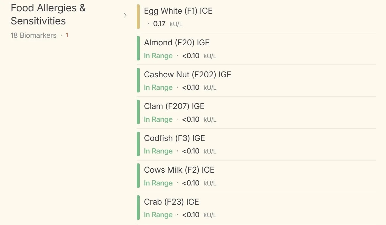 For example, my LDL cholesterol is a bit high, my iron saturation is down quite a lot over last year's tests, and -- I had no idea of this previously -- turns out I'm allergic to egg whites.